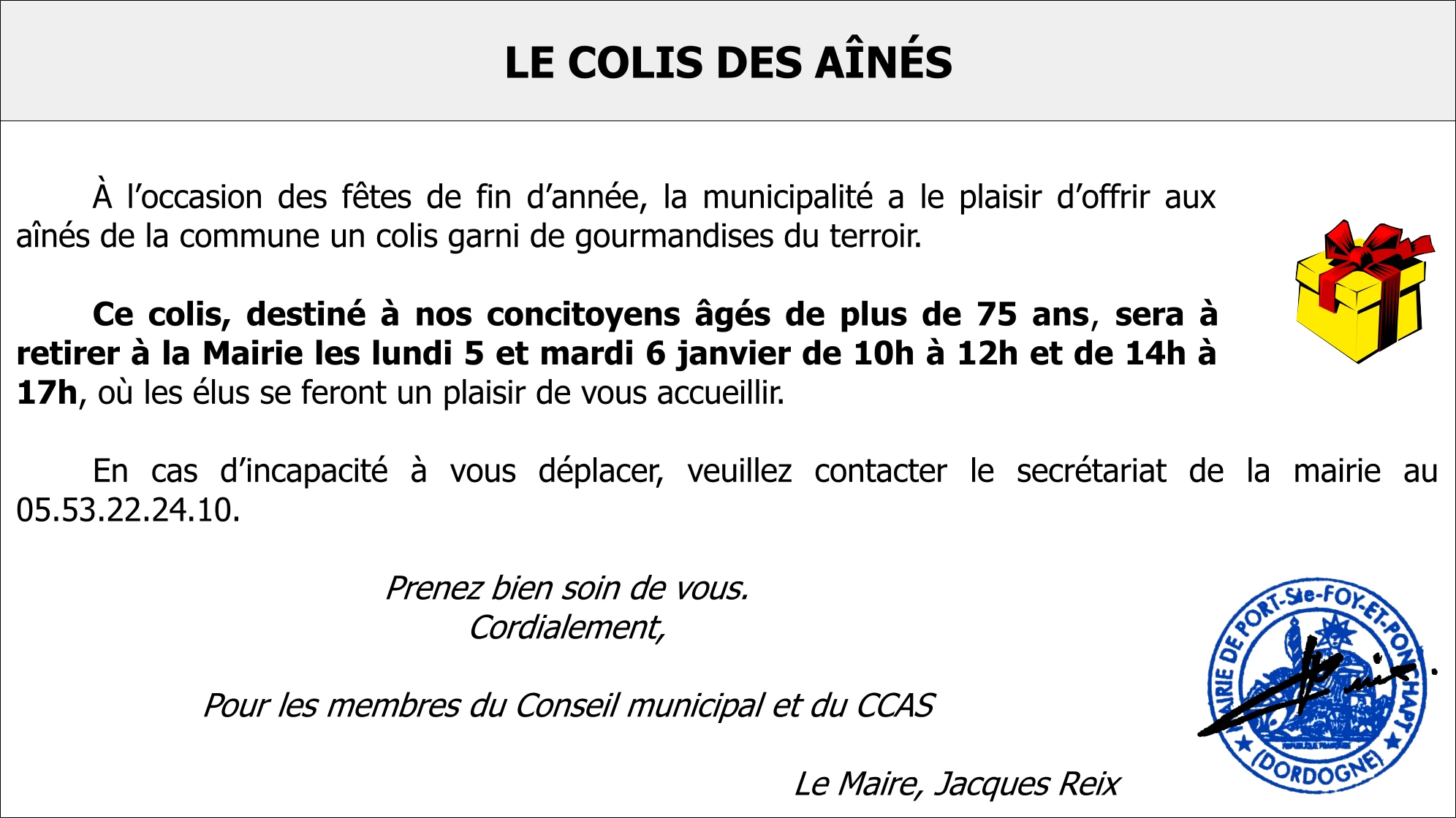 Ce colis, destiné à nos concitoyens âgés de plus de 75 ans, sera à retirer à la Mairie les lundi 5 et mardi 6 janvier de 10h à 12h et de 14h à 17h, où les élus se feront un plaisir de vous accueillir.